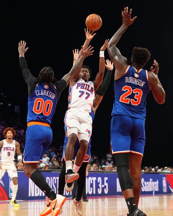 本场比赛恩比德和乔治依然没有出战,来到阿布扎比完全就是旅游的,一分钟都没打,都是坐在场下观战。没有两位核心,76人在场上也是陷入被动,上来就被尼克斯压制着,之后一直处于被动局面,完全无法跟上节奏,最多落后高达18分,好在最后换上替补球员的时候,76人这边成功将分差迫近,一度只剩下5分,可还是未能实现逆转。